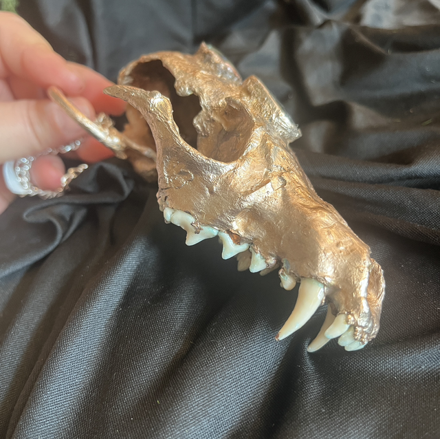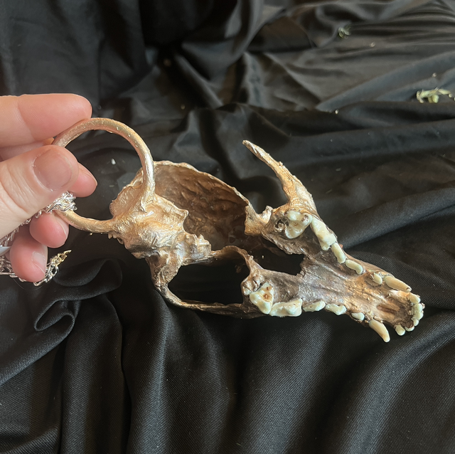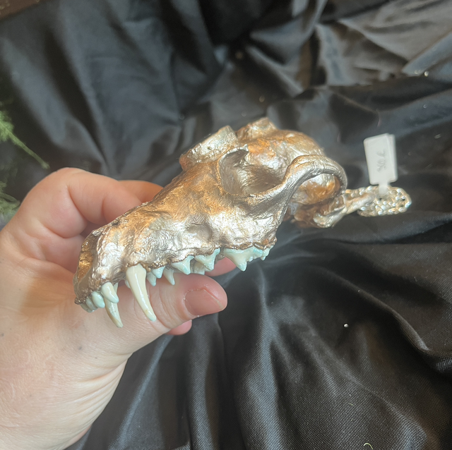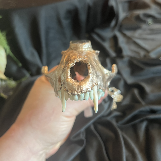 This fox skull, with its original teeth meticulously preserved, has first been electroformed in copper—giving it structure, strength, and alchemical resonance. It is then silver-plated, creating a striking surface of lunar radiance over its earthen heart.