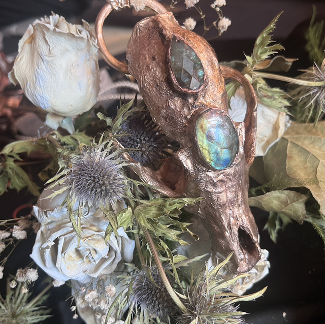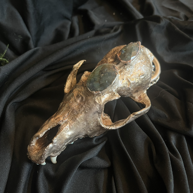 Two labradorites are embedded into the skull: one a luminous teardrop crowning its brow, the other nested beneath, echoing the pull of deep waters and memory. The entire inner structure is reinforced with clear jewelry resin, sealing the piece and offering protection—both physical and symbolic.