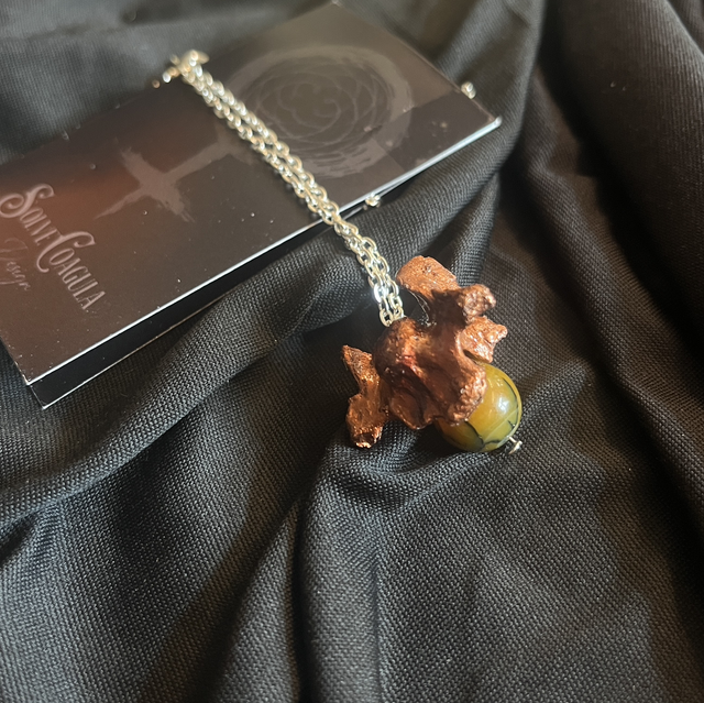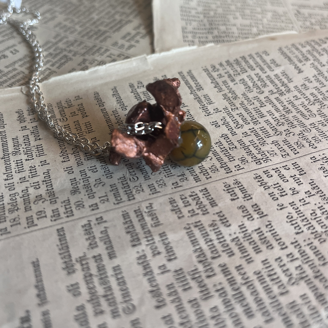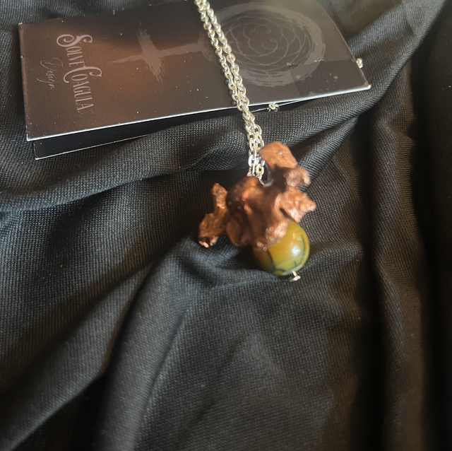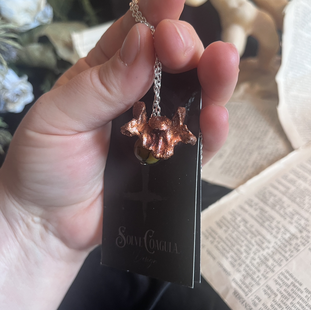 A mink vertebra, copper-electroformed and preserved in intricate detail, becomes the spine of this piece—steady, instinctual, and enduring. It is paired with howlite, a stone of stillness and reflection, black-veined like frozen lightning.