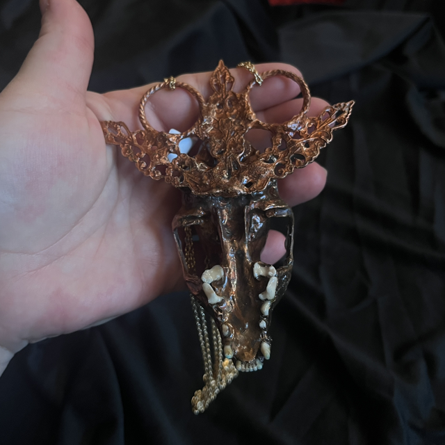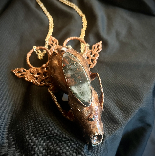 At its heart lies an authentic mink skull, preserved with its original teeth bared in eternal defiance. The skull is framed by ornate filigree detailing, evoking antique ritual adornments. Set into the copper is a piece of African Bloodstone—deep green with splashes of red, said to carry protective and grounding properties. Secured at two anchor points, this piece hangs with balance and power, ready to be worn as a charm, a curse, or a declaration. Not for the faint-hearted.