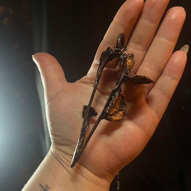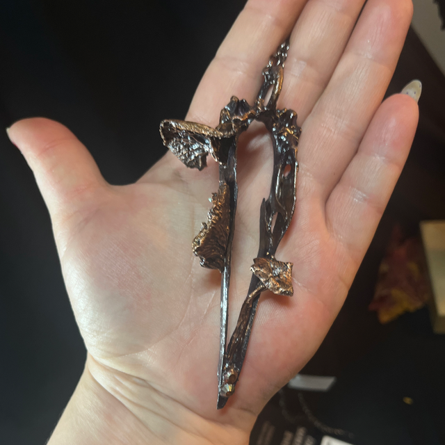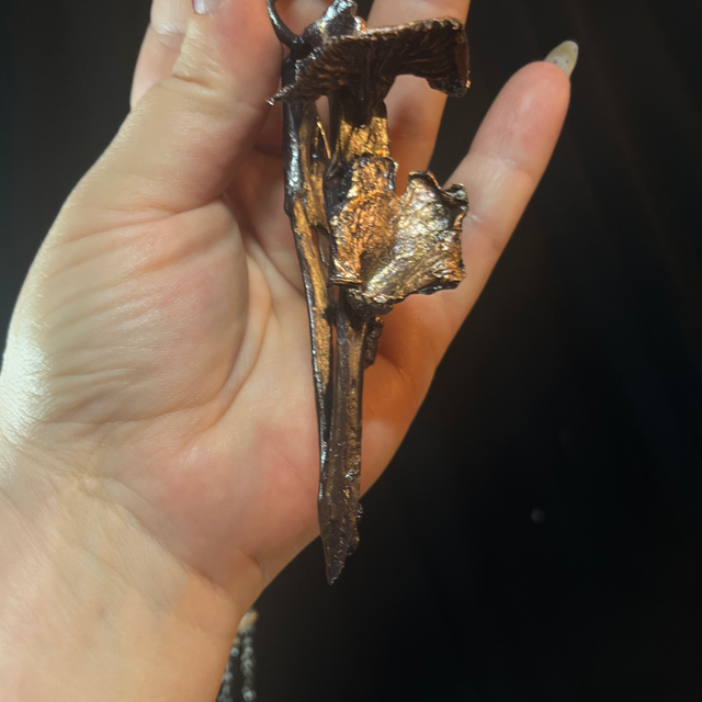 The Crow’s Whisper Pendant is a striking and one-of-a-kind piece of jewelry that artfully combines a genuine crow’s beak with real funnel chanterelles, handpicked by my father-in-law.
