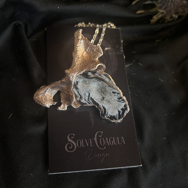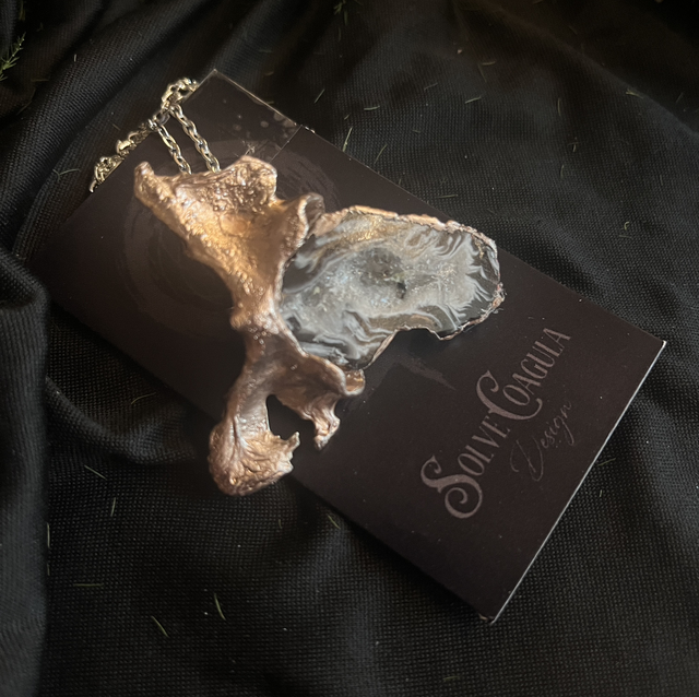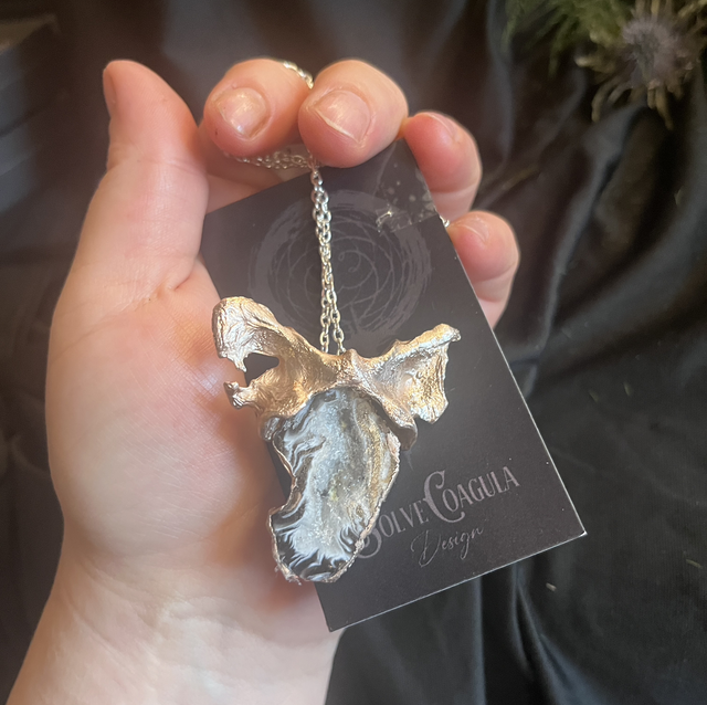The vertebra has been carefully silver-plated, preserving its raw anatomical form while elevating it into something regal and enduring. Set into the natural arch of the bone is a piece of onyx, shimmering with mineral texture and subtle depth. The contrast between organic bone and crystalline structure creates a bold, sacred harmony—like a relic from a forgotten ritual.