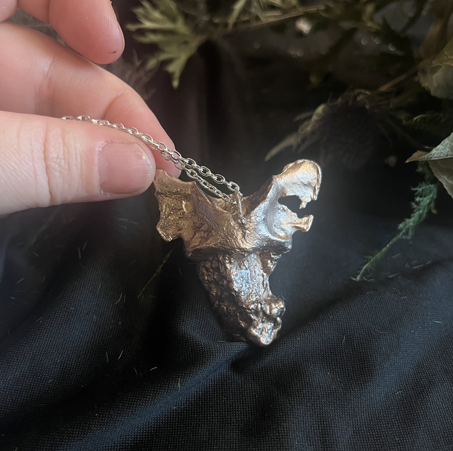 Crown of the Spine is a striking amulet of balance and unseen strength. At its center rests a real fox atlas vertebra, the topmost bone of the spine—named after the mythic titan who bore the weight of the heavens. This bone represents the gateway between mind and body, thought and action.