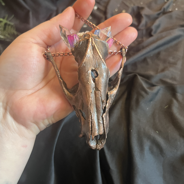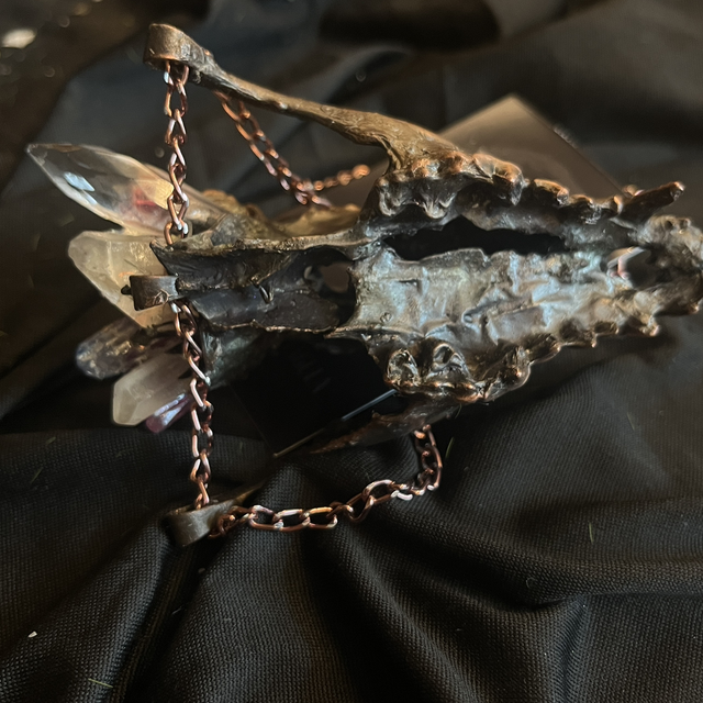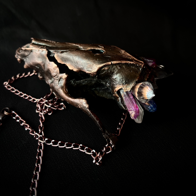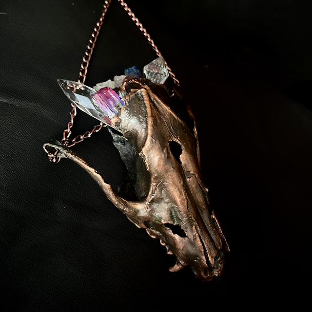 Crystal Host is a fusion of bone and brilliance—a copper-electroformed raccoon dog skull pierced with glass, titanium aura quartz, and clear rock crystal. Inspired by the iconography of tattoo art, where skulls crack open to reveal inner crystal cores, this piece echoes the idea that transformation begins from within.