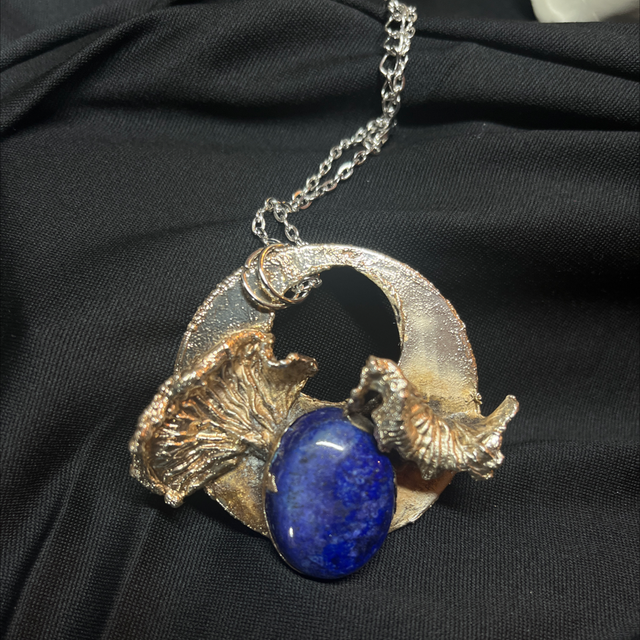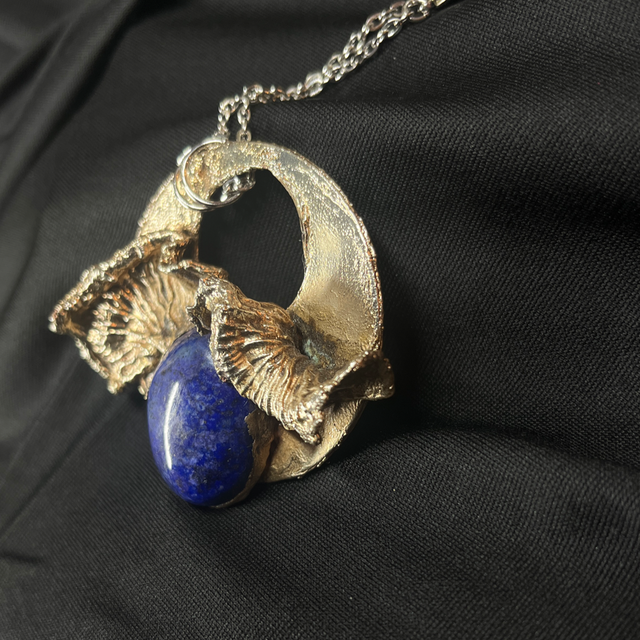 This unique piece of jewelry combines the beauty of nature and elegance of gemstones. Crafted with real funnel chanterelles, the design is enhanced by a layer of copper plating and finished with silver for a luxurious touch. The deep blue hues of lapis lazuli add a striking contrast, making this accessory a stunning blend of organic elements and timeless craftsmanship. Perfect for those who appreciate both the natural world and refined style, this jewelry piece is truly one of a kind.