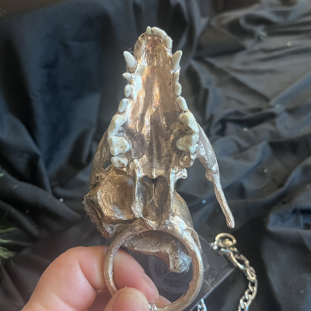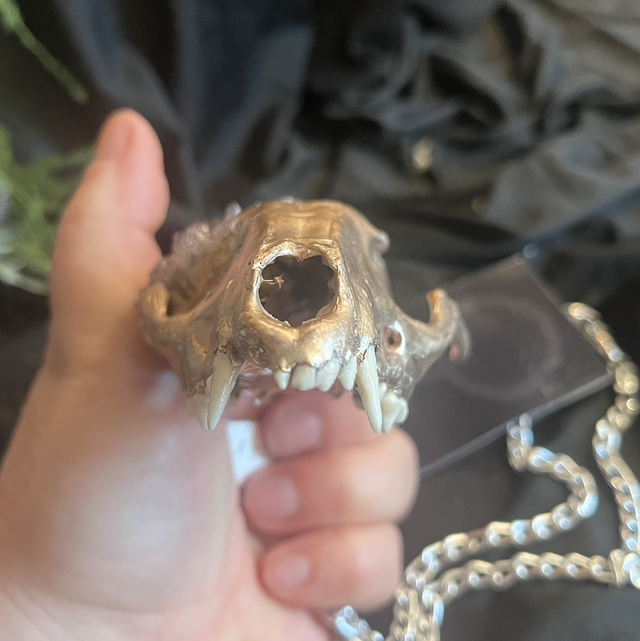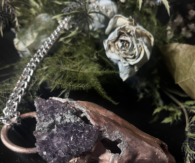 This silver-plated raccoon dog skull—its original teeth intact—bears the marks of transformation: a natural split in the crown reveals a geode-like growth of raw druzy amethyst, blooming where bone once held silence.