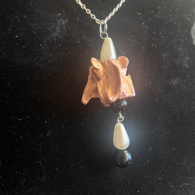 At its center rests a real copper electroplated fox vertebra, worn smooth by time and preserved in its natural form. It is flanked by two pale, teardrop-shaped glass beads—soft and translucent, like captured breath—and anchored by two obsidian stones, dark and steady as forgotten altars.