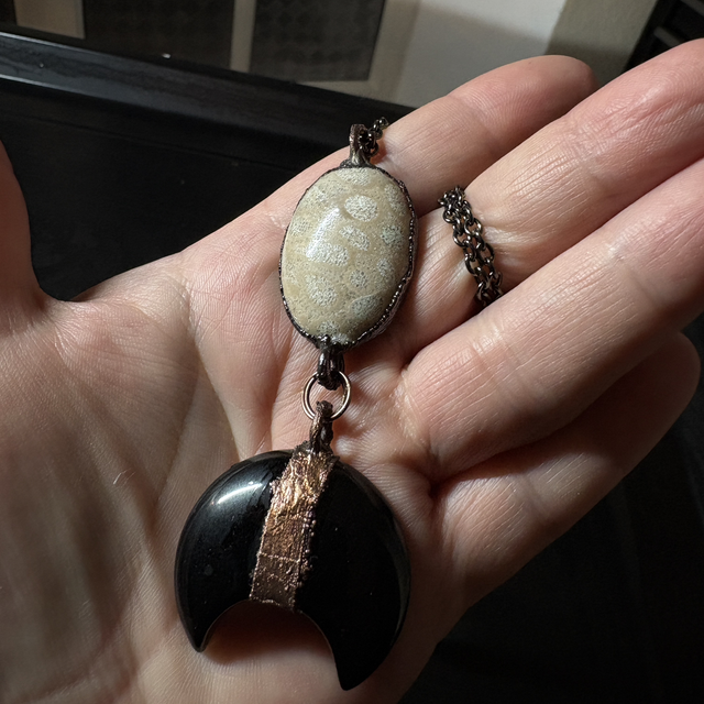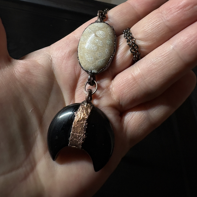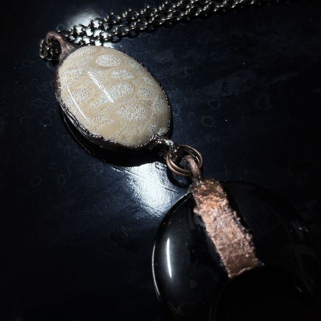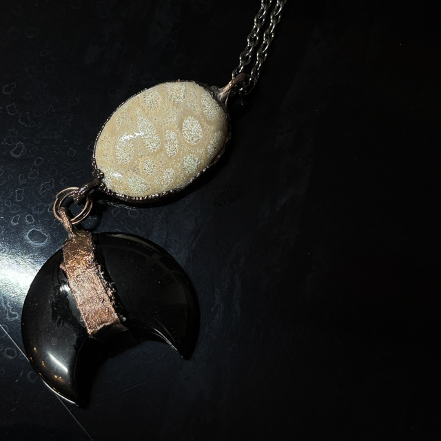 Crafted from warm copper-plated metal, this 50 cm necklace features a unique agatized coral fossil, symbolizing ancient wisdom and life’s enduring flow. From it hangs a crescent-shaped obsidian, a stone of protection, introspection, and transformation, evoking the mysterious pull of the moon on our inner tides.