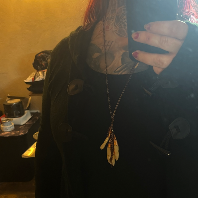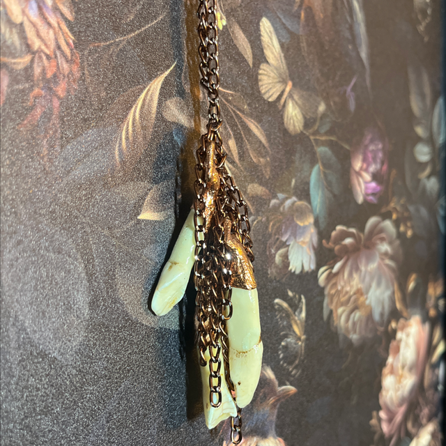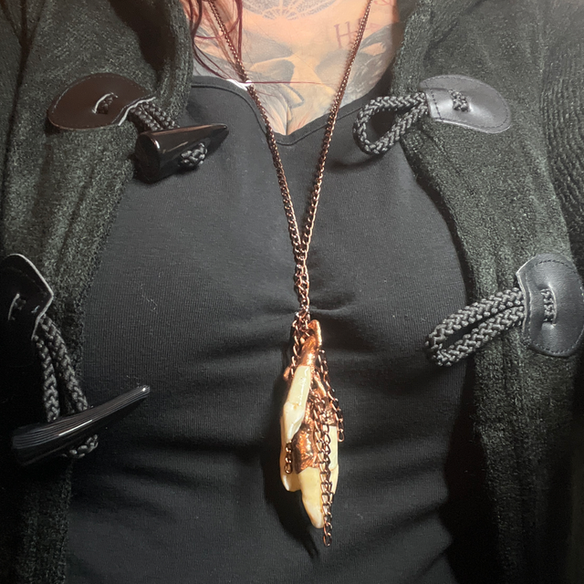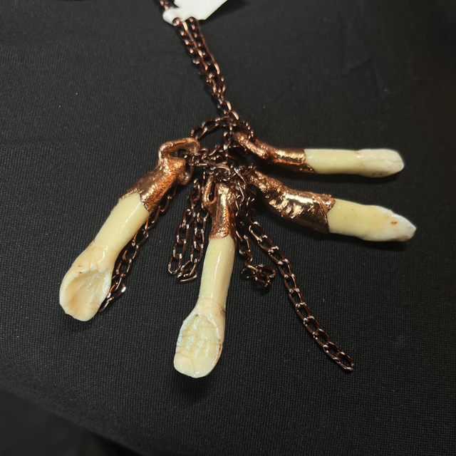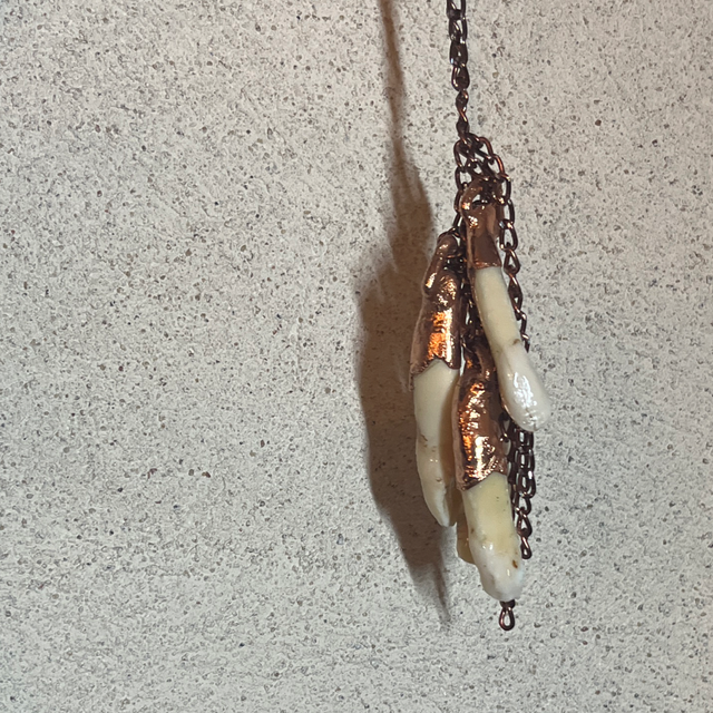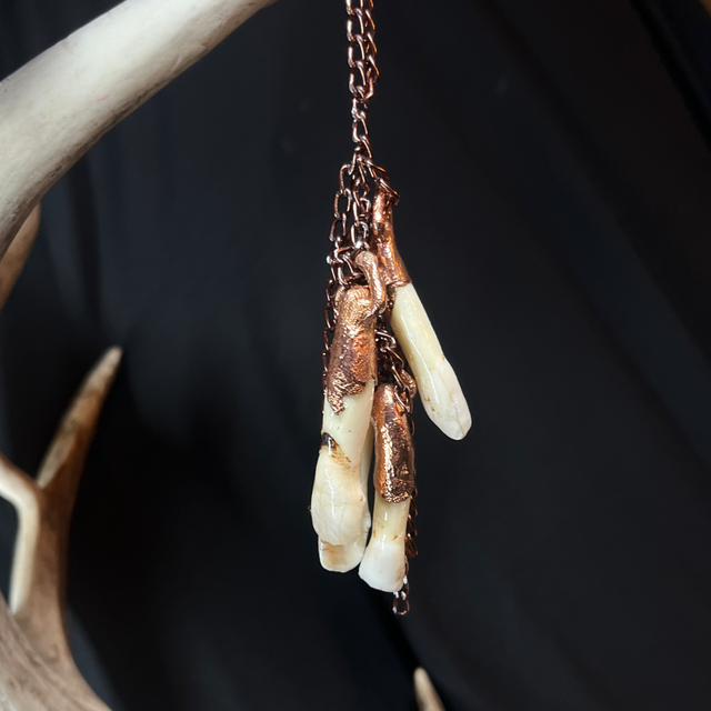 This stunning piece not only pays homage to this ancient custom but also showcases the unique beauty of the moose teeth, enhanced by the warm glow of copper.