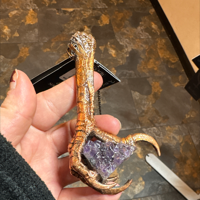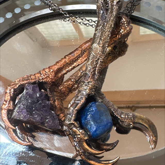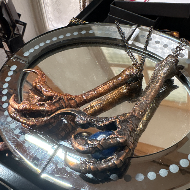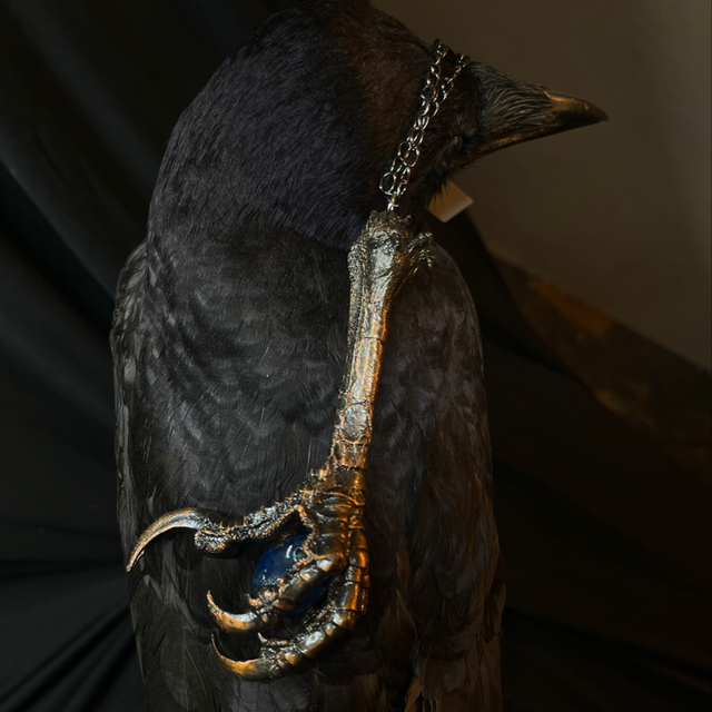 Raven’s Grip Raven’s Grip is a unique copper electroplated and patinated pendant featuring an authentic raven’s foot from Sodankylä, Finland. The claw firmly grasps a shimmering gemstone, symbolizing strength, mystery, and the powerful connection between nature and the spirit world. This handcrafted piece combines the wild elegance of the raven with the raw beauty of natural elements, making it a statement of both mysticism and bold style. The pendant measures ~11,5cm in height and it weights ~40 grams. It comes with a steel chain of 58cm.