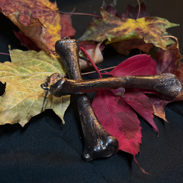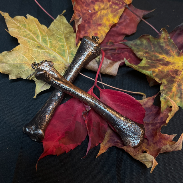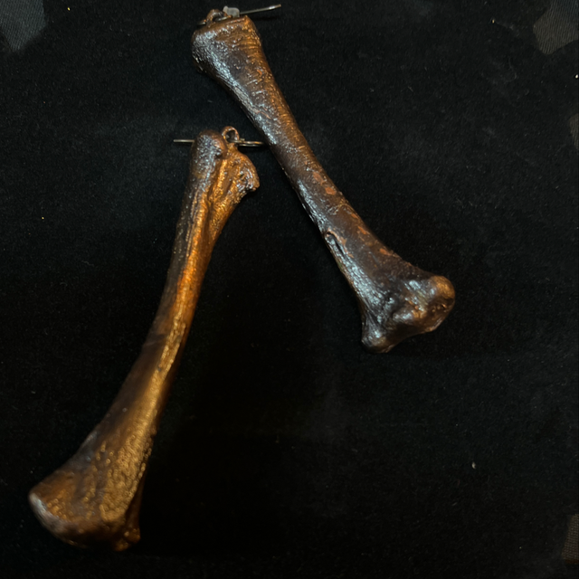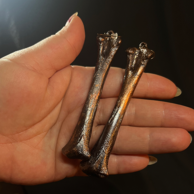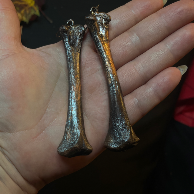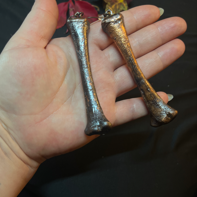 The Raven’s Legacy earrings are crafted from genuine raven bones, meticulously encased in a copper finish.