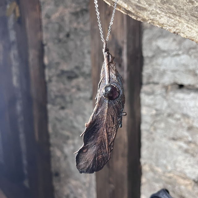 Real copperplated and patinated chicken feather with cabochon amethyst.