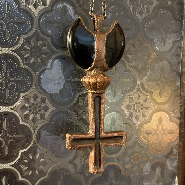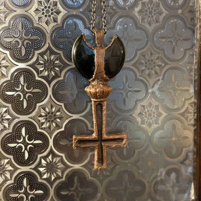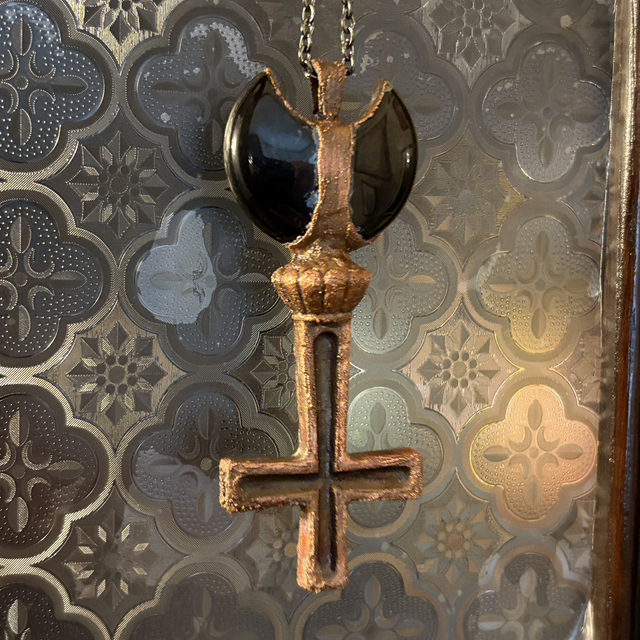 This necklace is made from a real cross recovered a coffin, preserved through copper electroforming to seal its history, touch, and time into metal. Once placed beside the dead, it now exists as a relic between worlds.