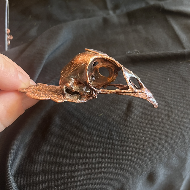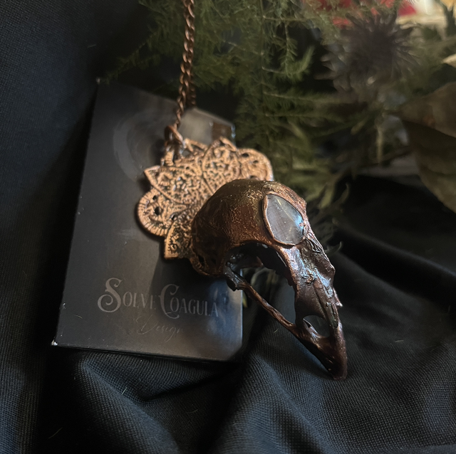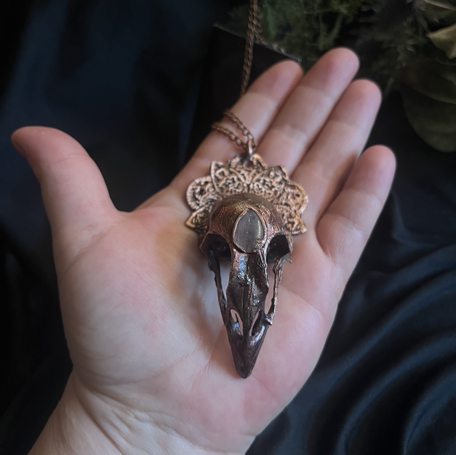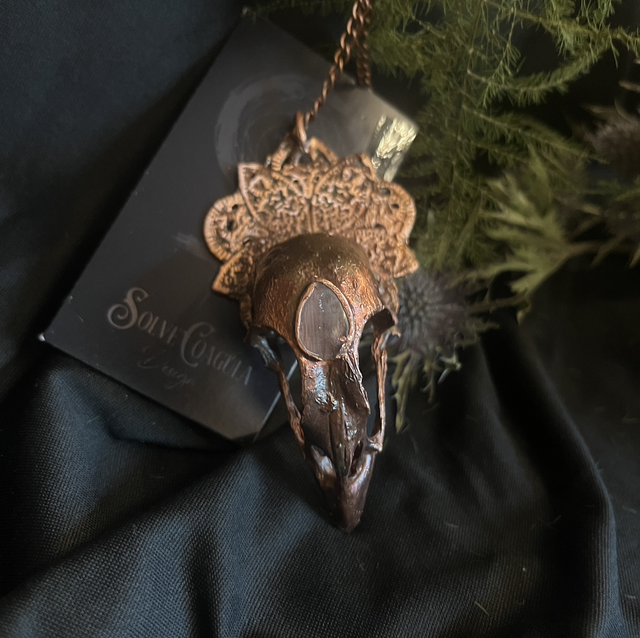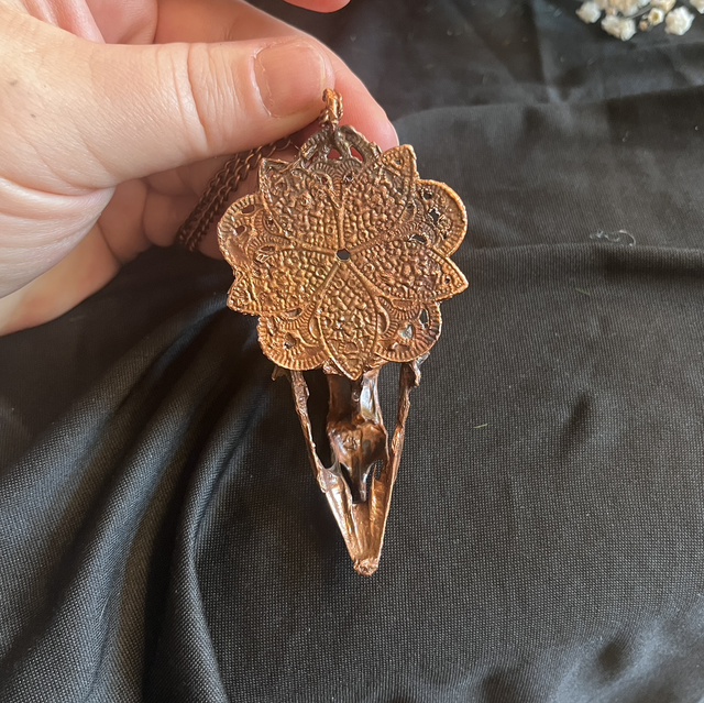 At its center rests a real pheasant skull, copper-electroplated to preserve its graceful form for eternity. Soft pink rose quartz nestles beside it, radiating quiet healing energy. The skull is anchored to a mandala-like frame, echoing symmetry and sacred geometry.