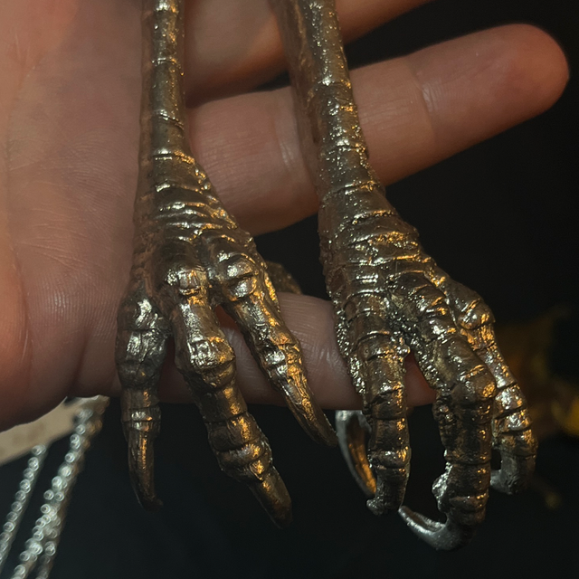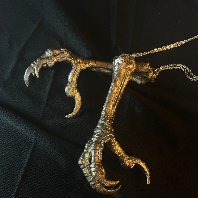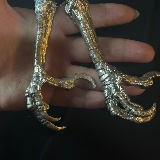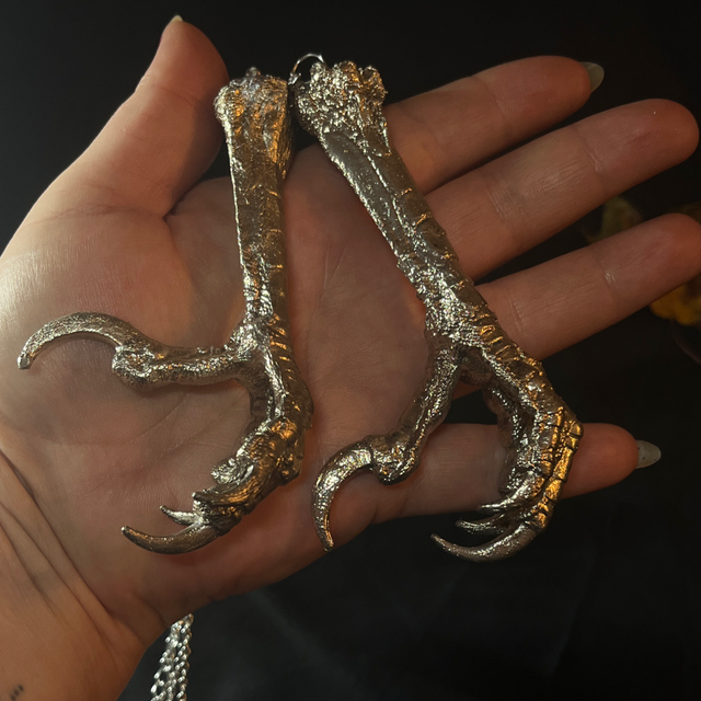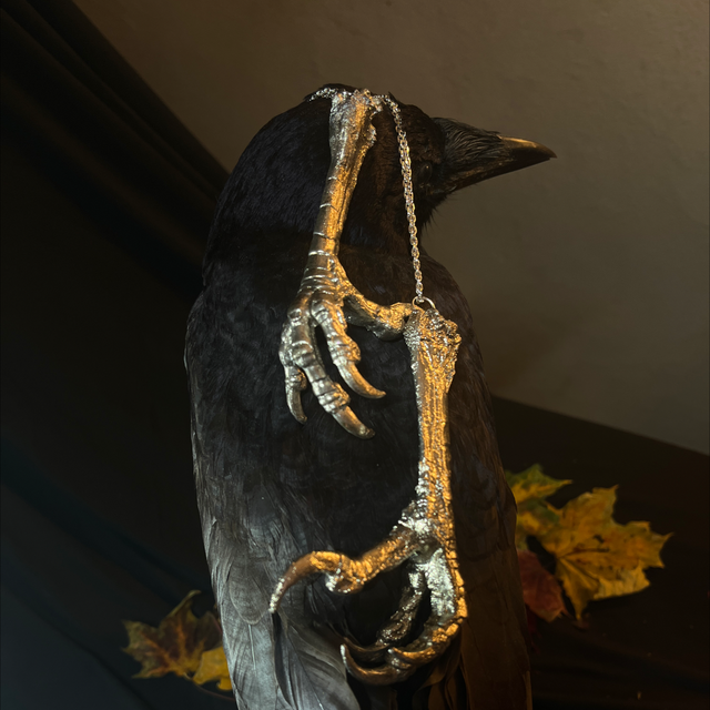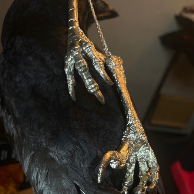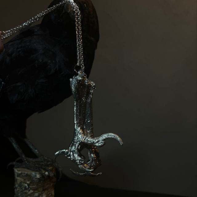 This talisman is a striking amulet crafted from an ethically sourced raven’s foot, elegantly plated in silver to enhance its mystical allure.
