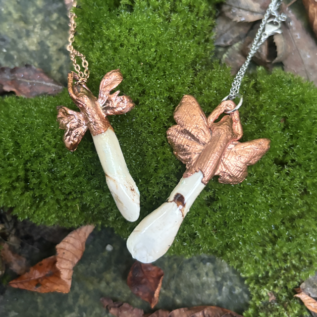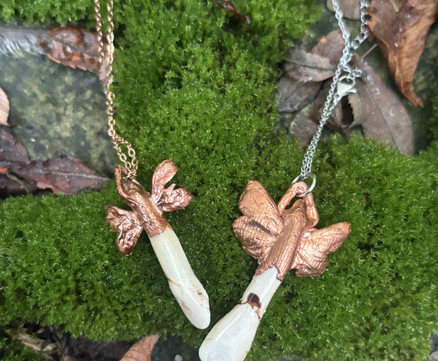 Tooth Fairy is an enchanting pendant crafted from a real elk tooth and genuine moth wings preserved through the ancient art of copper electroforming.