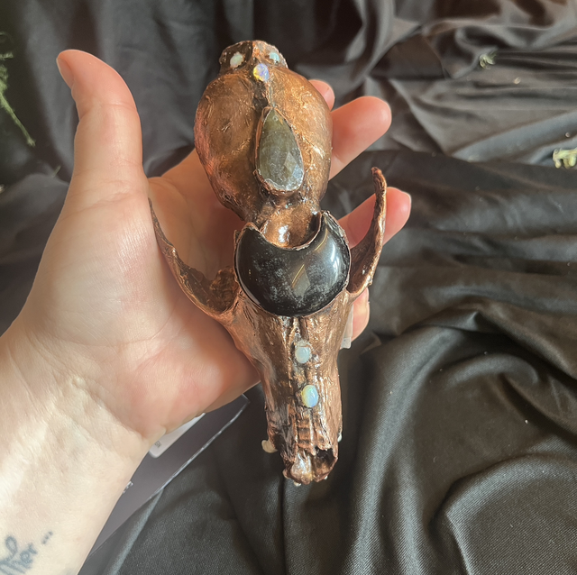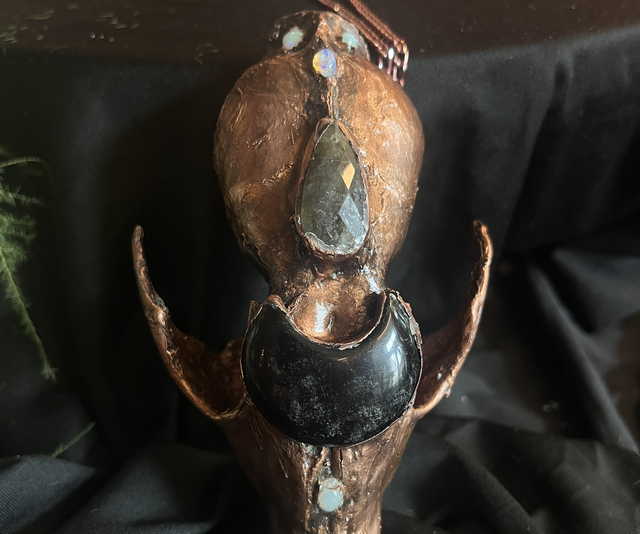 A crescent of obsidian rests on its brow: a mirror of shadows and a shield for the unseen. on top of it glows a labradorite teardrop, flickering with hidden light. Five opals form a starpath across the skull, casting iridescent whispers as the piece moves with the wearer.