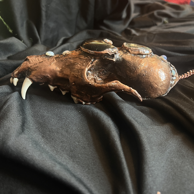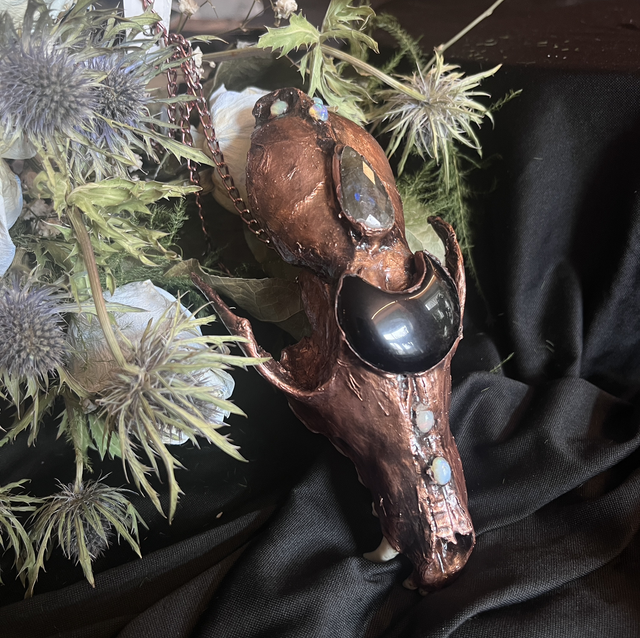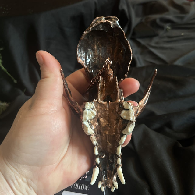 This full copper-electroformed fox skull, with its original teeth preserved, holds more than earthly memory. Inside, a layer of clear jewelry resin offers both strength and ritual containment, making the piece not just wearable—but warded.